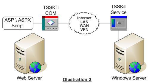 Illustration 2 above shows the the unique feature of being able to integrate the desktop functionality into an existing website or server management application. The TSSKill Service runs as a Windows service in any Windows Server. Using our TSSKill COM object you specify the IP address, Port, and login credentials for any TSSKill Service and a list of sessions are passed back to your web application. Implementing the same functionality as our TSSKill Desktop, the COM object exposes functions to release a session and send a session user a message allowing them to be warned before they are disconnected.