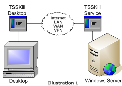 Illustration 1 above shows the desktop to server functioanlity. The TSSKill Service runs as a Windows service on any Windows Server. Using our TSSKill Desktop stand-alone application, you choose from a previously saved list of servers that have the TSSKill Service running. Upon connecting, all sessions are displayed along with Session ID, IP, Logon Time, etc. Options are presented for logging off any particular session or sending a message to the session user allowing them to be warned before they are disconnected.